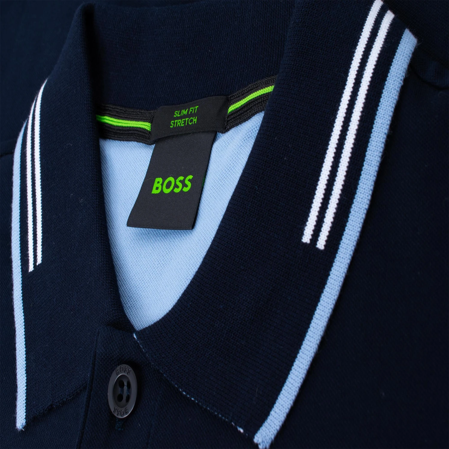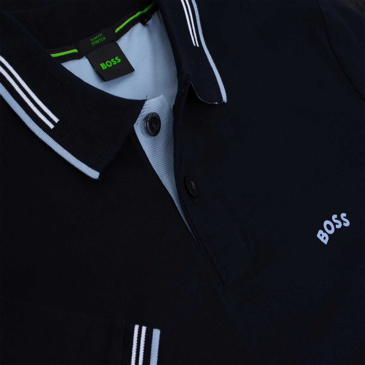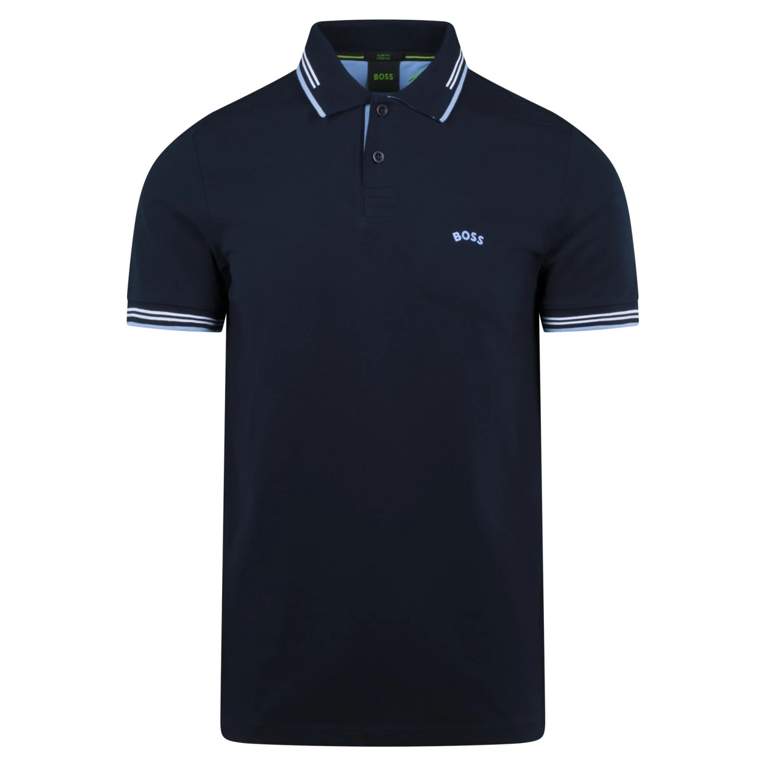The Paul Curved is a slim-fitting mens polo shirt with a branded undercollar, by BOSS Menswear. Detailed with contrast tipping at the collar and cuffs, this short-sleeved polo shirt is designed in stretch-cotton piqué for breathable comfort. A curved, printed BOSS logo adds the finishing touch at the left chest. This versatile polo is equally at home both on the golf course, or in the clubhouse post-round – Season after season, the Paul Curved is guaranteed to become a wardrobe staple!
