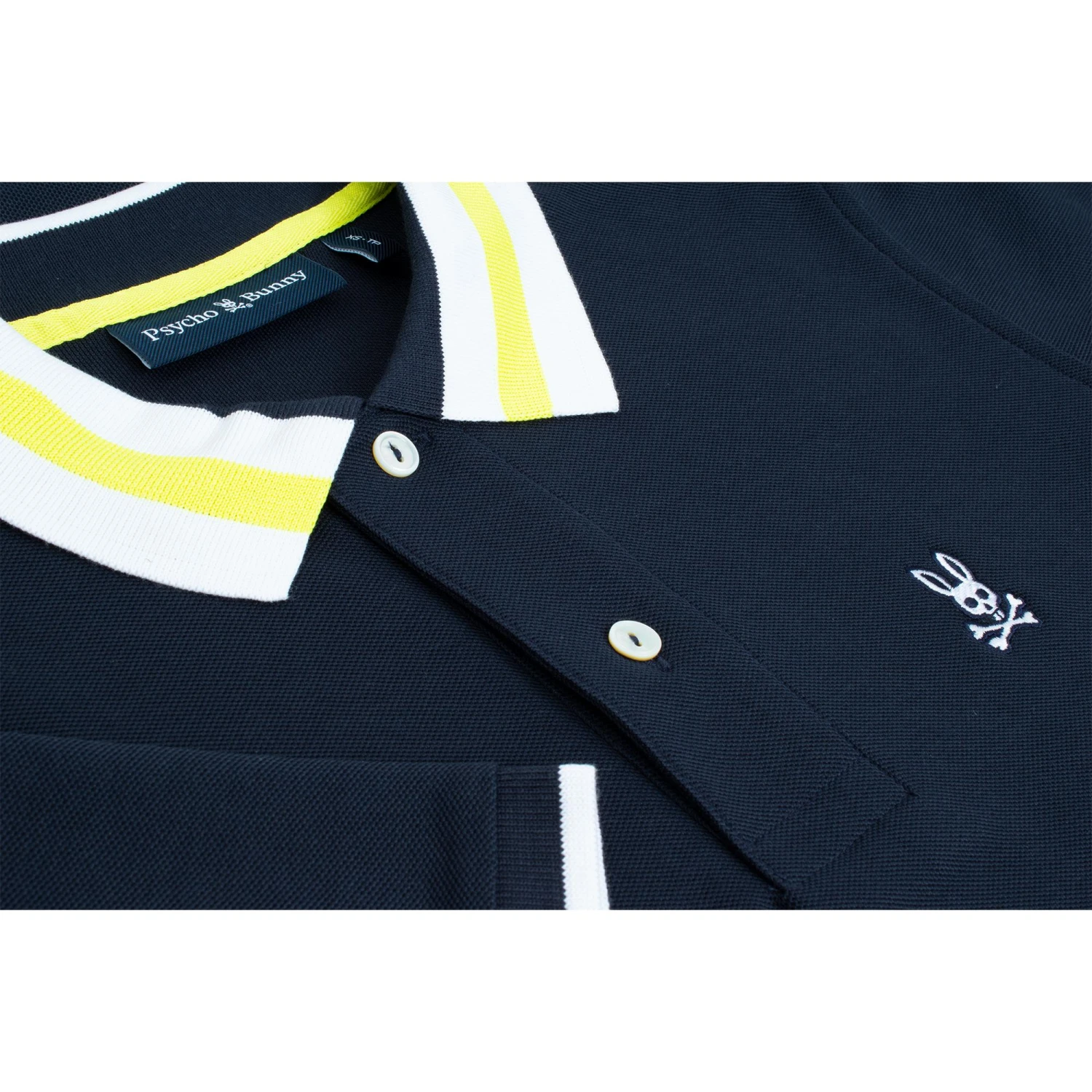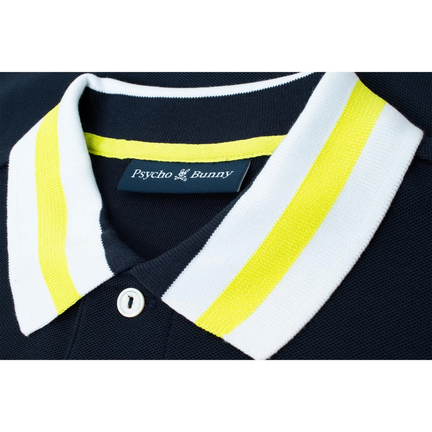 The Pima cotton piqué men’s Alva piqué fashion polo from Psycho Bunny’s SS23 collection, with its bold tri-stripe collar, has enough fun and flair to elevate any basic ensemble. With comfort guaranteed by the pima cotton piqué, additional detailing is provided by the mother-of-pearl buttons and the eye-catching embroidered bunny logo on the left chest. This versatile polo is perfect for summer both on and off the golf course!